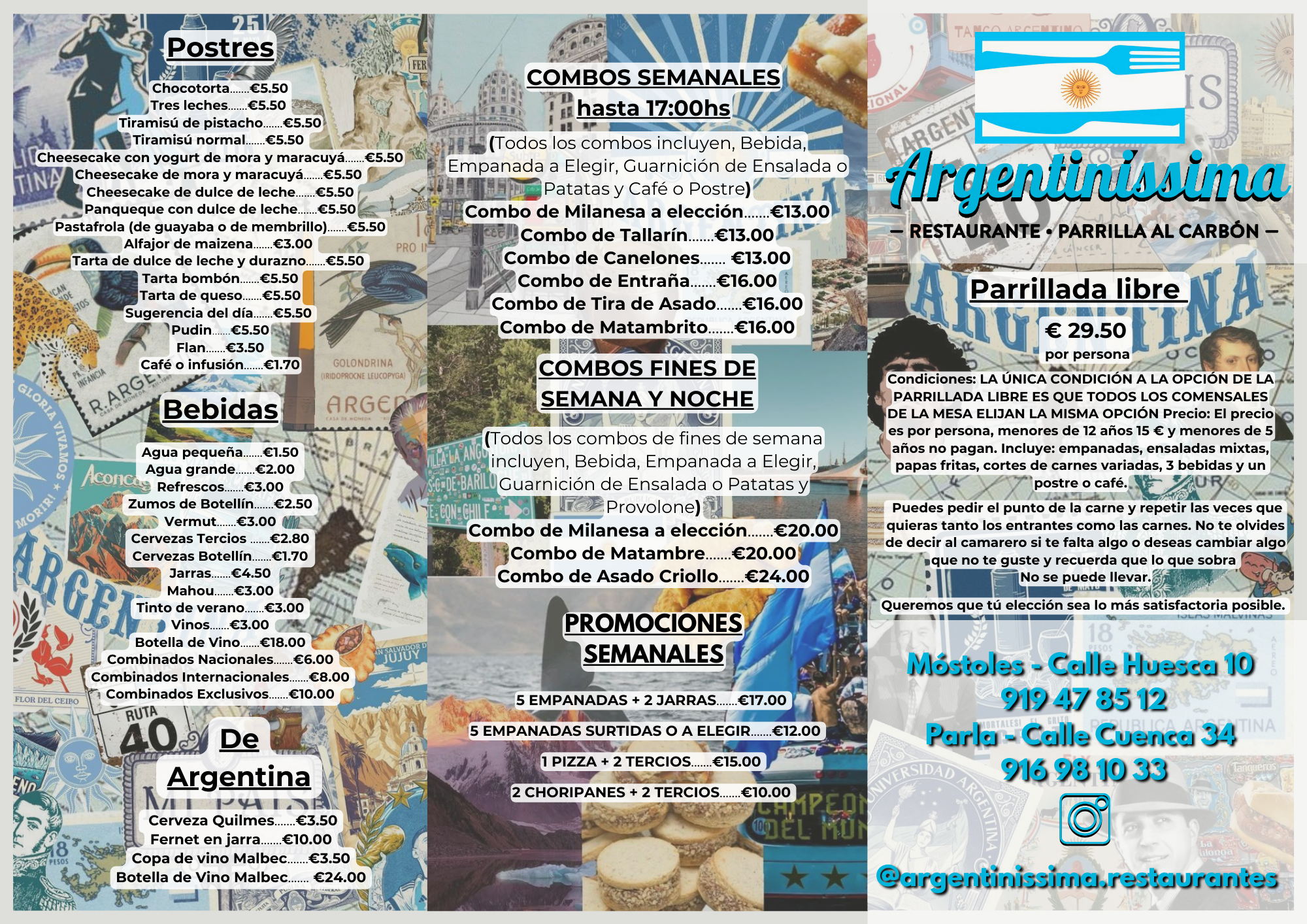 Nuestra carta posee una amplia selección de platillos que fusionan la culinaria argentina y española, ofreciéndote la oportunidad de disfrutar y elegir entre las diferentes opciones. Disponemos de una variedad de carnes de primera calidad, y logramos a través de nuestras salsas, condimentos y métodos de preparación destacar la rica tradición culinaria argentina.  ¡Te invitamos a explorar nuestras opciones!